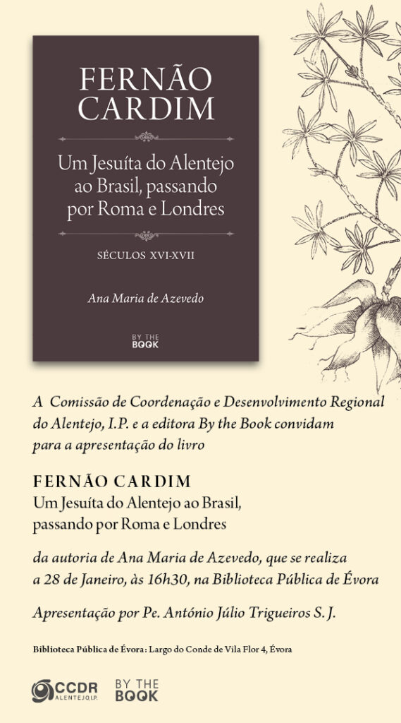 No próximo dia 28 de janeiro, pelas 16h30, irá decorrer a apresentação do Livro “Fernão Cardim – Um Jesuíta do Alentejo ao Brasil, passando por Roma e Londres, Séculos XVI-XVII“. A obra de autoria de Ana Maria de Azevedo, será apresentada pelo Pe. António Júlio Trigueiros S.J. na Biblioteca Pública de Évora.