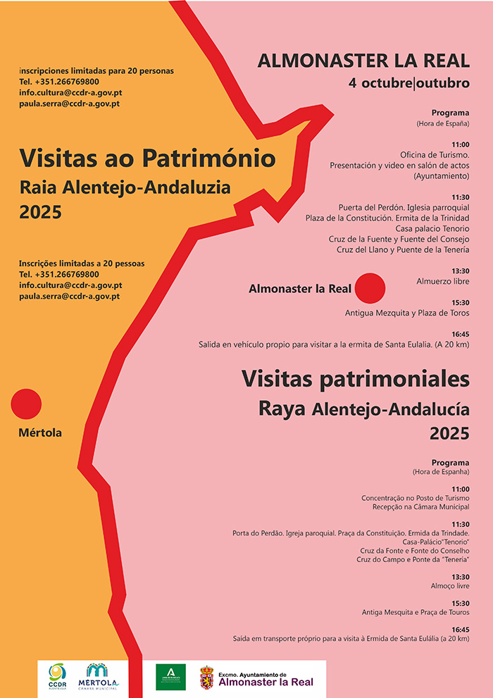 Estão agora a ser realizadas as visitas na Raia Alentejo-Andaluzia, organizadas pela Unidade de Cultura da Comissão de Coordenação e Desenvolvimento Regional do Alentejo, I.P. e a Junta da Andaluzia, com a colaboração, neste caso, da Câmara Municipal de Mértola e do Ayuntamiento de Almonaster la Real.